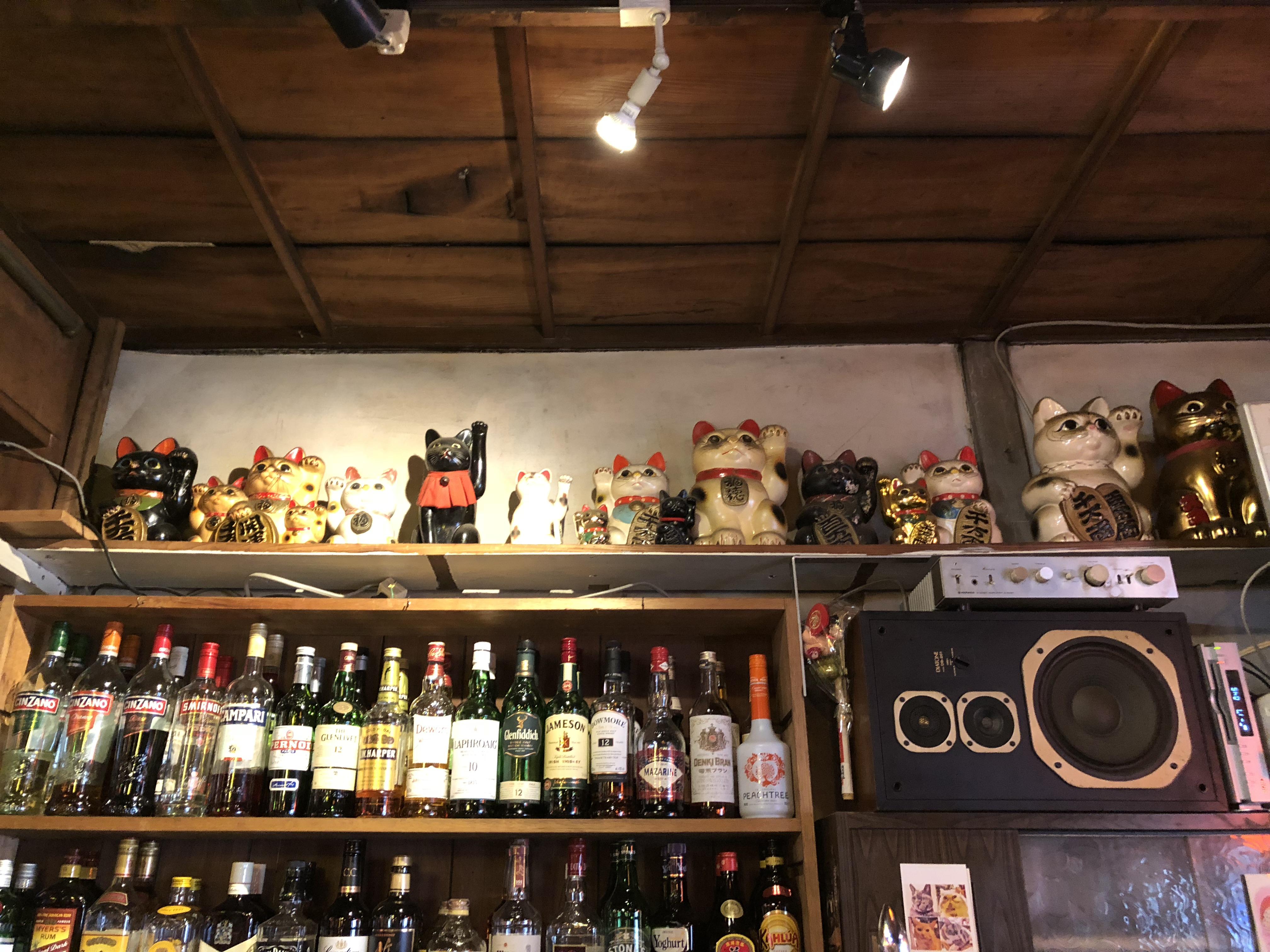 カウンターの上にはお酒と招き猫がいっぱい!